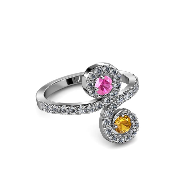 A divine symbol of togetherness, where one stone represents love and one friendship while each end of the ring swirls around the marvelous combination of Pink Sapphire & Citrine meeting above and below, rather than in the center.