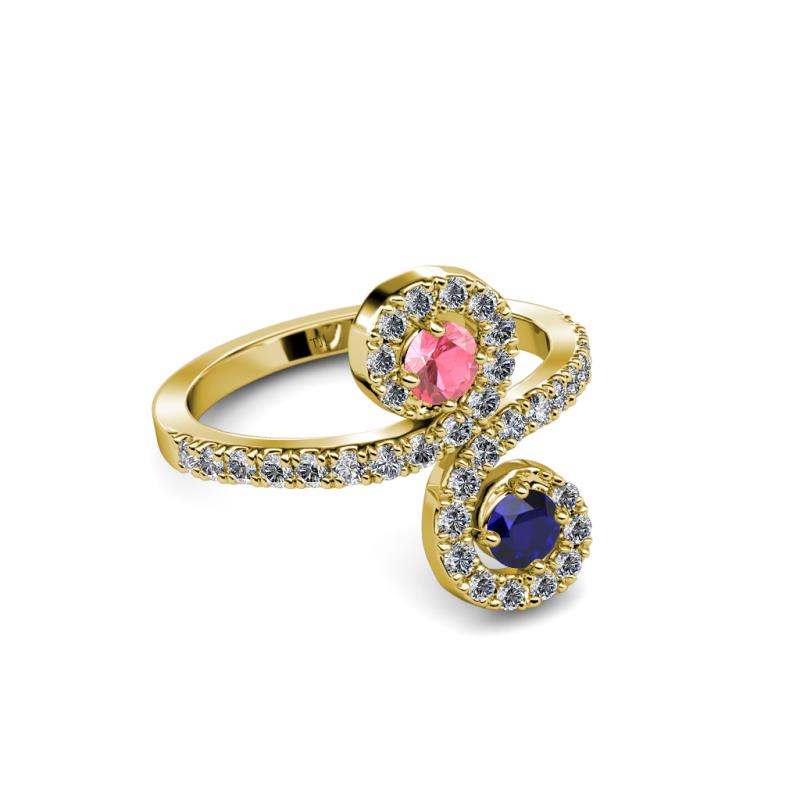 A divine symbol of togetherness, where one stone represents love and one friendship while each end of the ring swirls around the marvelous combination of Pink Tourmaline & Blue Sapphire meeting above and below, rather than in the center.