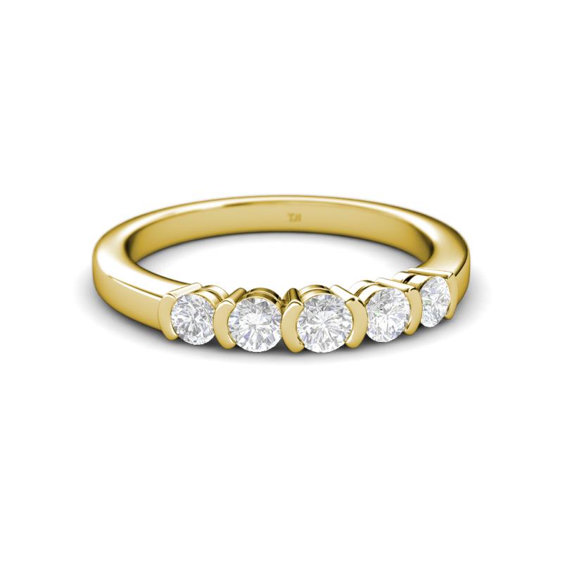 A Wedding Band of 0.80 ctw with Center & Side Stones Round White Sapphire is a true everlasting symbol of your love so cherish it with one of a kind band featuring Half Bezel set 5 Stone Wedding Band which shows your lifelong commitment.