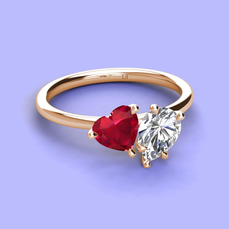 There's something so romantic, and oh-so-enchanting about this duo two stone engagement ring. This spectacular design features Heart Shape Lab Created Ruby and Pear Shape GIA Certified Diamond that sets at slight angles towards each other.
