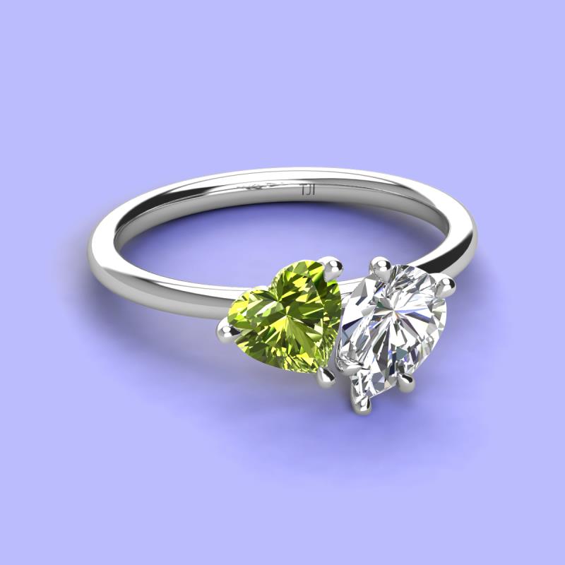 There's something so romantic, and oh-so-enchanting about this duo two stone engagement ring. This spectacular design features Heart shape Peridot and Pear Shape GIA Certified Diamond that sets at slight angles towards each other.
