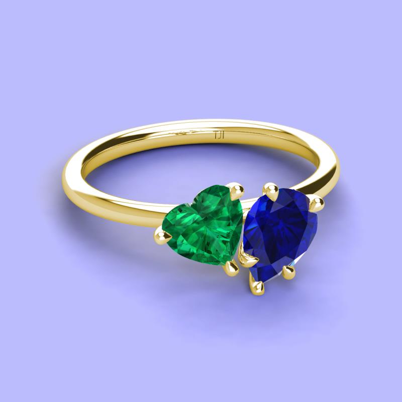 There's something so romantic, and oh-so-enchanting about this duo two stone engagement ring. This spectacular design features Heart Shape Lab Created Emerald and Pear Shape Lab Created Blue Sapphire that sets at slight angles towards each other.