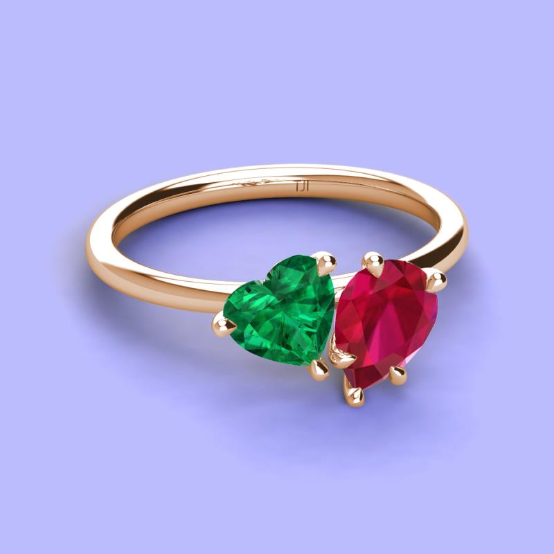 There's something so romantic, and oh-so-enchanting about this duo two stone engagement ring. This spectacular design features Heart Shape Lab Created Emerald and Pear Shape Lab Created Ruby that sets at slight angles towards each other.
