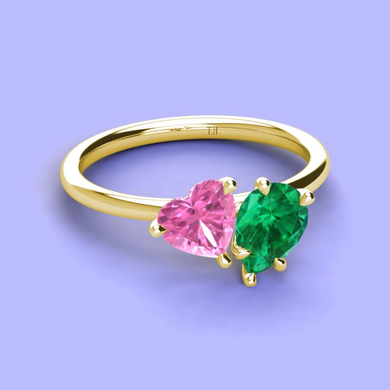 There's something so romantic, and oh-so-enchanting about this duo two stone engagement ring. This spectacular design features Heart & Pear Shape Lab Created Pink Sapphire & Created Emerald that sets at slight angles towards each other.