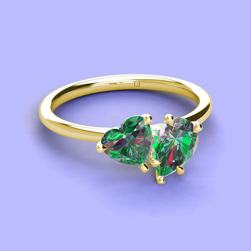 There's something so romantic, and oh-so-enchanting about this duo two stone engagement ring. This spectacular design features Heart & Pear Shape Lab Created Alexandrite that sets at slight angles towards each other.