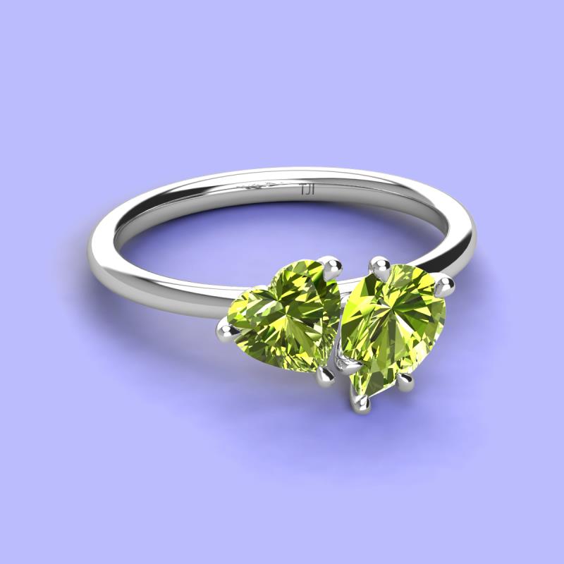 There's something so romantic, and oh-so-enchanting about this duo two stone engagement ring. This spectacular design features Heart & Pear shape Peridot that sets at slight angles towards each other.