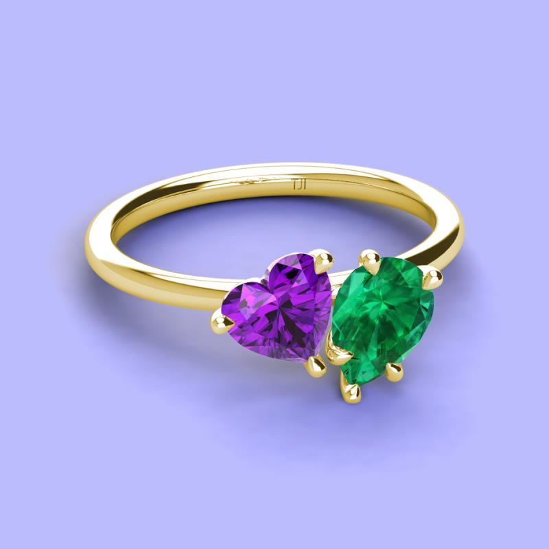 There's something so romantic, and oh-so-enchanting about this duo two stone engagement ring. This spectacular design features Heart shape Amethyst and Pear Shape Lab Created Emerald that sets at slight angles towards each other.