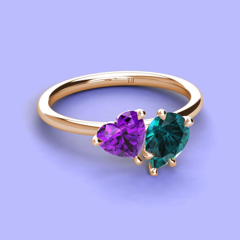 There's something so romantic, and oh-so-enchanting about this duo two stone engagement ring. This spectacular design features Heart shape Amethyst and Pear Shape London Blue Topaz that sets at slight angles towards each other.