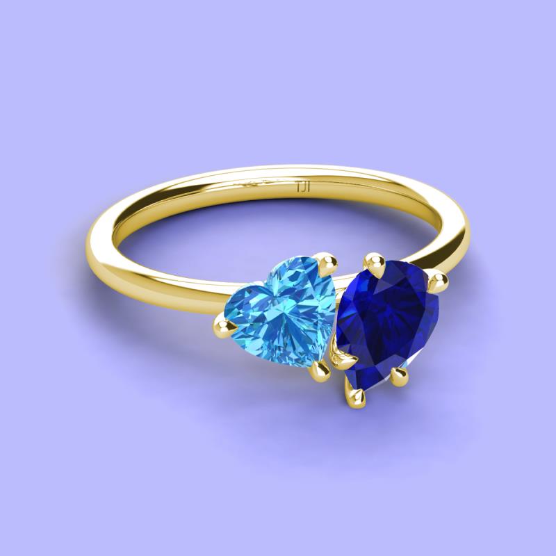There's something so romantic, and oh-so-enchanting about this duo two stone engagement ring. This spectacular design features Heart shape Blue Topaz and Pear Shape Lab Created Blue Sapphire that sets at slight angles towards each other.