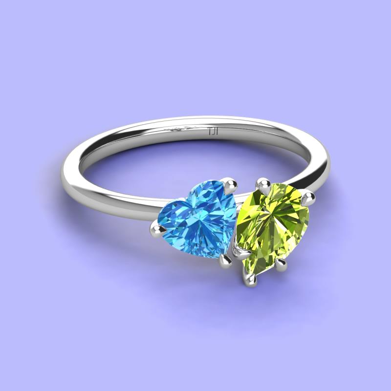 There's something so romantic, and oh-so-enchanting about this duo two stone engagement ring. This spectacular design features Heart shape Blue Topaz and Pear Shape Peridot that sets at slight angles towards each other.