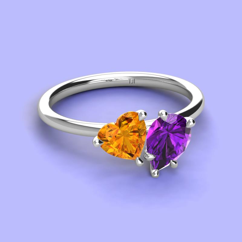 There's something so romantic, and oh-so-enchanting about this duo two stone engagement ring. This spectacular design features Heart shape Citrine and Pear Shape Amethyst that sets at slight angles towards each other.
