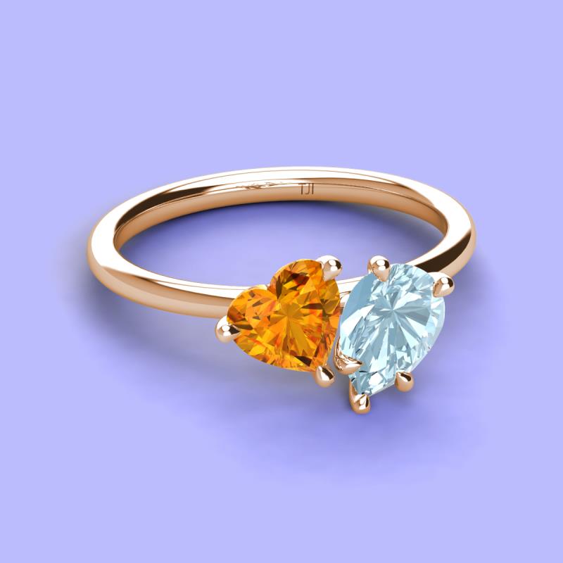 There's something so romantic, and oh-so-enchanting about this duo two stone engagement ring. This spectacular design features Heart shape Citrine and Pear Shape Aquamarine that sets at slight angles towards each other.