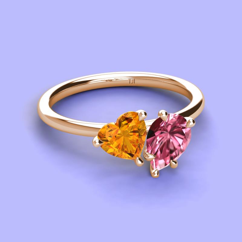 There's something so romantic, and oh-so-enchanting about this duo two stone engagement ring. This spectacular design features Heart shape Citrine and Pear Shape Pink Tourmaline that sets at slight angles towards each other.