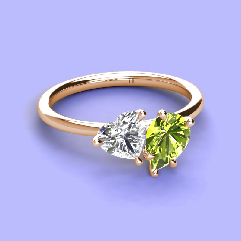 There's something so romantic, and oh-so-enchanting about this duo two stone engagement ring. This spectacular design features Heart Shape Forever Brilliant Moissanite and Pear Shape Peridot that sets at slight angles towards each other.