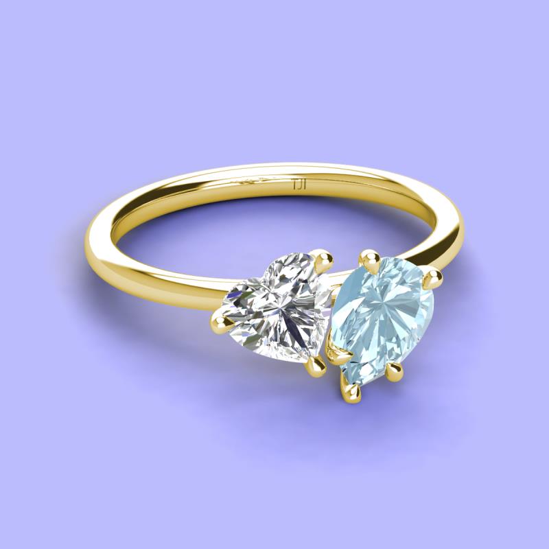 There's something so romantic, and oh-so-enchanting about this duo two stone engagement ring. This spectacular design features Heart Shape Forever One Moissanite and Pear Shape Aquamarine that sets at slight angles towards each other.