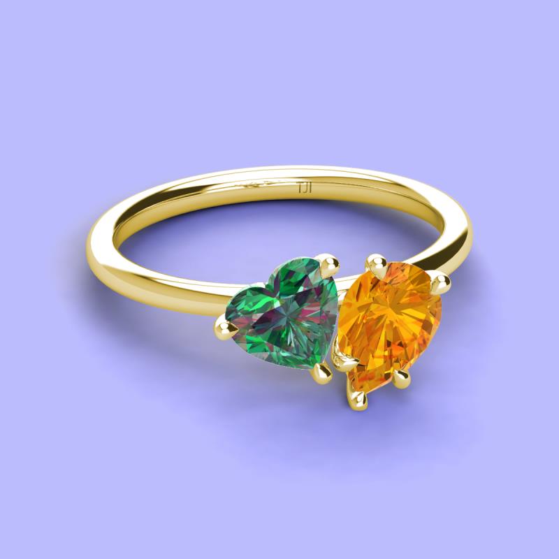 There's something so romantic, and oh-so-enchanting about this duo two stone engagement ring. This spectacular design features Heart Shape Lab Created Alexandrite and Pear Shape Citrine that sets at slight angles towards each other.