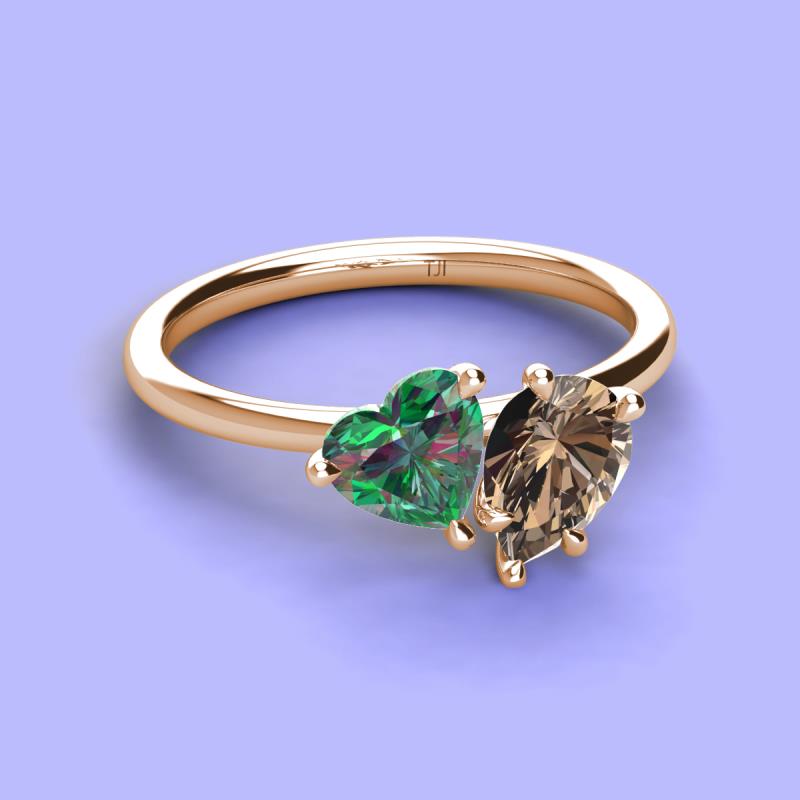 There's something so romantic, and oh-so-enchanting about this duo two stone engagement ring. This spectacular design features Heart Shape Lab Created Alexandrite and Pear Shape Smoky Quartz that sets at slight angles towards each other.