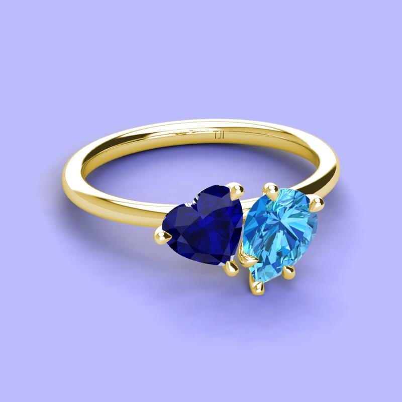 There's something so romantic, and oh-so-enchanting about this duo two stone engagement ring. This spectacular design features Heart Shape Lab Created Blue Sapphire and Pear Shape Blue Topaz that sets at slight angles towards each other.