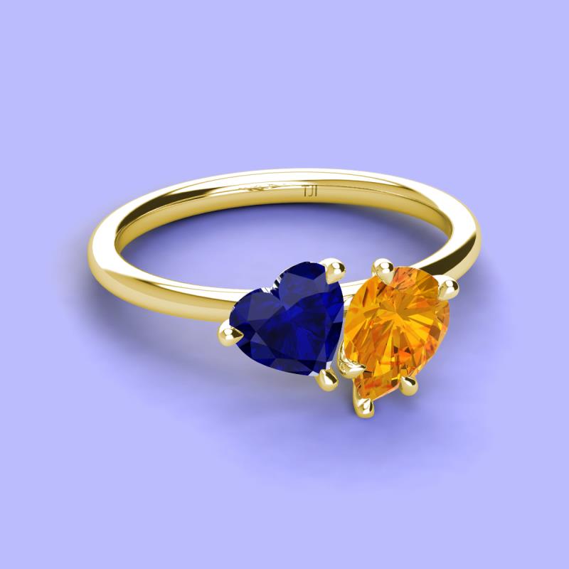 There's something so romantic, and oh-so-enchanting about this duo two stone engagement ring. This spectacular design features Heart Shape Lab Created Blue Sapphire and Pear Shape Citrine that sets at slight angles towards each other.
