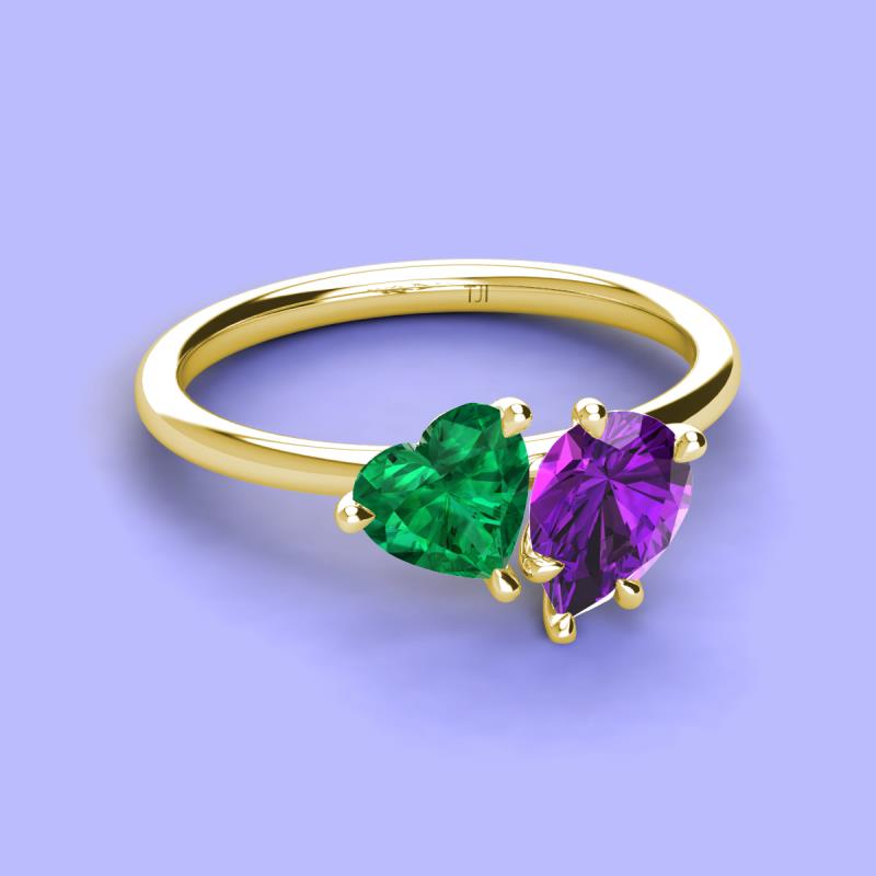 There's something so romantic, and oh-so-enchanting about this duo two stone engagement ring. This spectacular design features Heart Shape Lab Created Emerald and Pear Shape Amethyst that sets at slight angles towards each other.