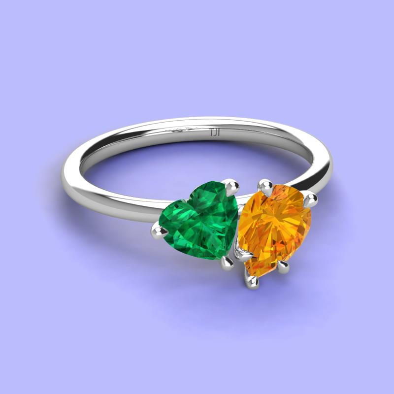 There's something so romantic, and oh-so-enchanting about this duo two stone engagement ring. This spectacular design features Heart Shape Lab Created Emerald and Pear Shape Citrine that sets at slight angles towards each other.