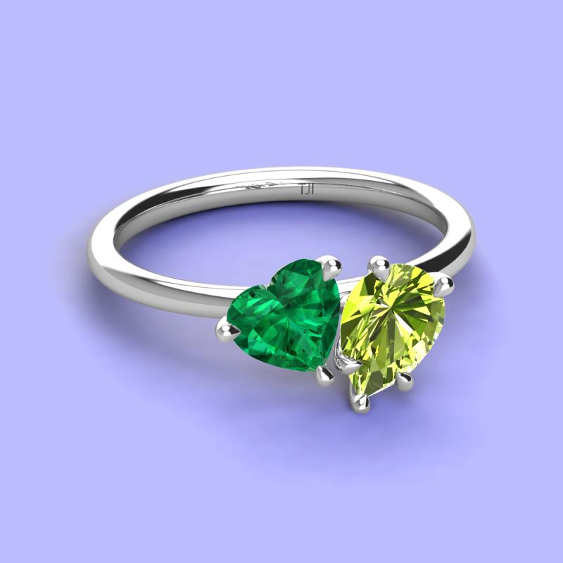 There's something so romantic, and oh-so-enchanting about this duo two stone engagement ring. This spectacular design features Heart Shape Lab Created Emerald and Pear Shape Peridot that sets at slight angles towards each other.