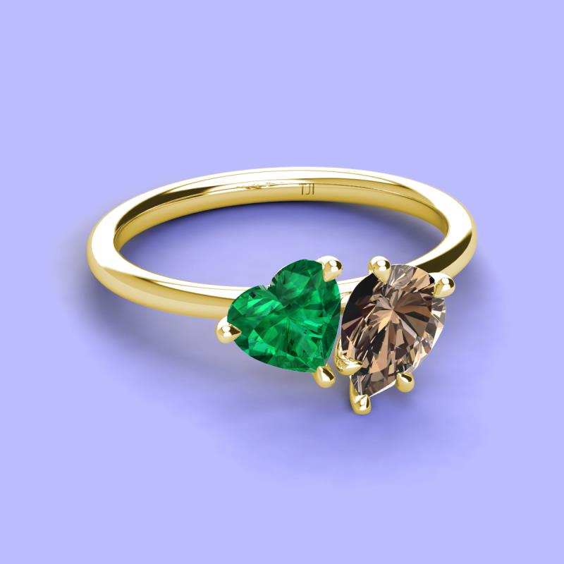 There's something so romantic, and oh-so-enchanting about this duo two stone engagement ring. This spectacular design features Heart Shape Lab Created Emerald and Pear Shape Smoky Quartz that sets at slight angles towards each other.
