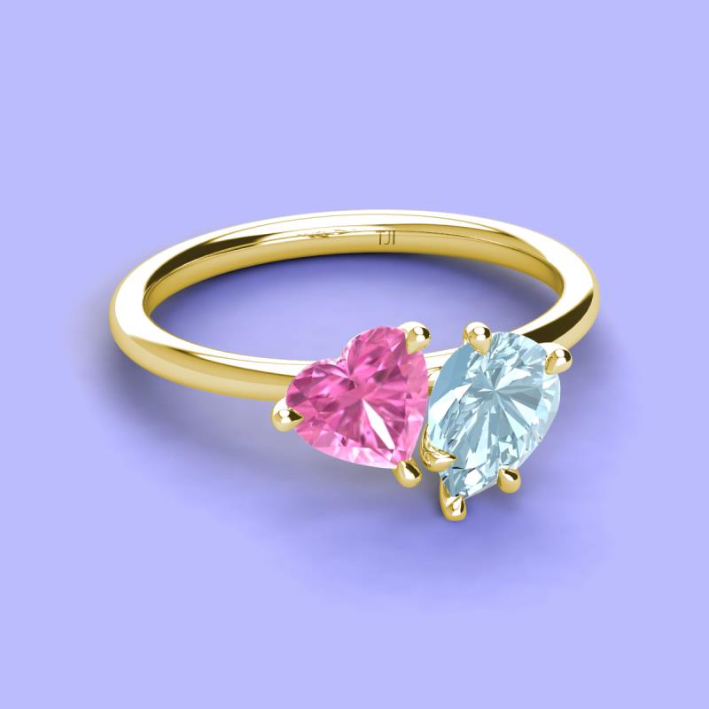 There's something so romantic, and oh-so-enchanting about this duo two stone engagement ring. This spectacular design features Heart Shape Lab Created Pink Sapphire and Pear Shape Aquamarine that sets at slight angles towards each other.
