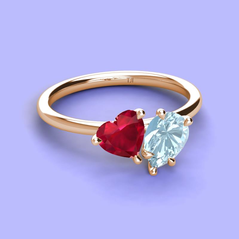There's something so romantic, and oh-so-enchanting about this duo two stone engagement ring. This spectacular design features Heart Shape Lab Created Ruby and Pear Shape Aquamarine that sets at slight angles towards each other.