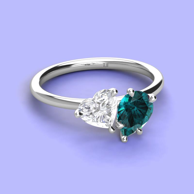 There's something so romantic, and oh-so-enchanting about this duo two stone engagement ring. This spectacular design features Heart Shape Lab Created White Sapphire and Pear Shape London Blue Topaz that sets at slight angles towards each other.