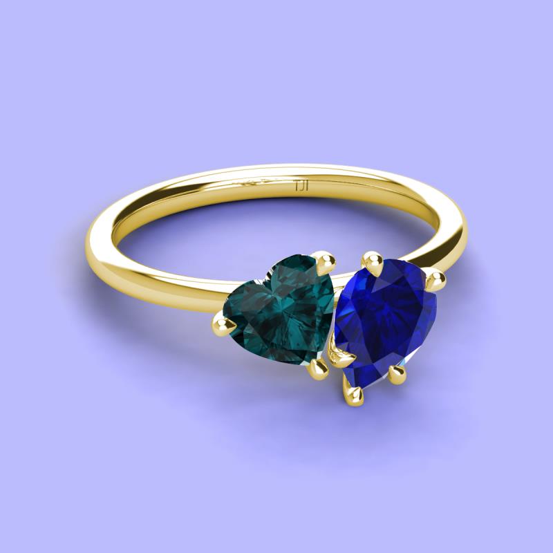 There's something so romantic, and oh-so-enchanting about this duo two stone engagement ring. This spectacular design features Heart shape London Blue Topaz and Pear Shape Lab Created Blue Sapphire that sets at slight angles towards each other.