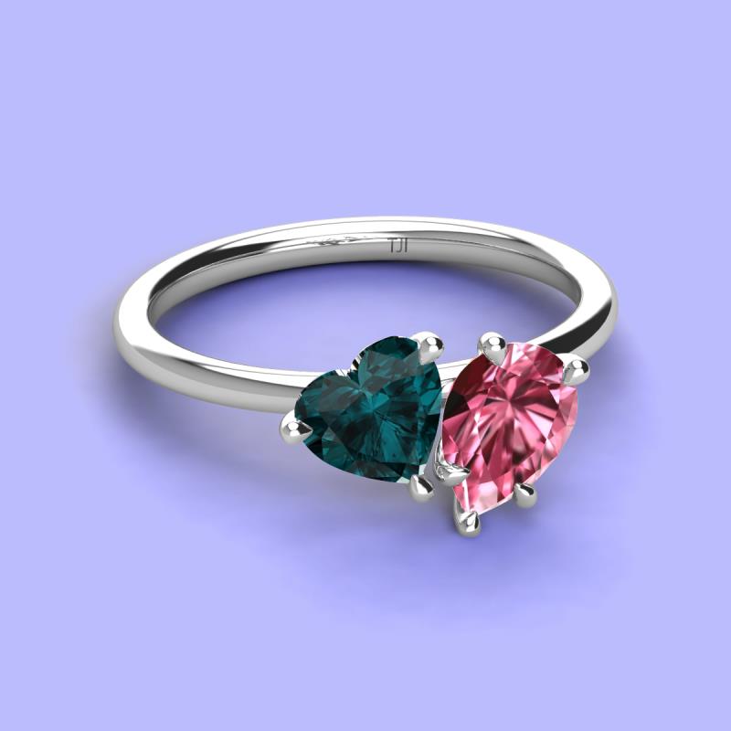 There's something so romantic, and oh-so-enchanting about this duo two stone engagement ring. This spectacular design features Heart shape London Blue Topaz and Pear Shape Pink Tourmaline that sets at slight angles towards each other.