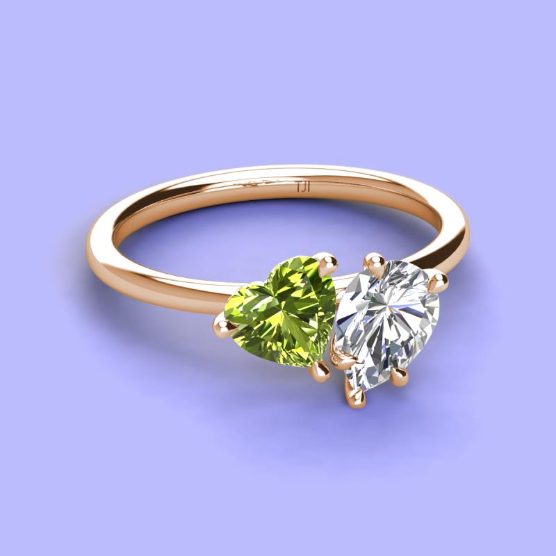 There's something so romantic, and oh-so-enchanting about this duo two stone engagement ring. This spectacular design features Heart shape Peridot and Pear Shape Forever One Moissanite that sets at slight angles towards each other.