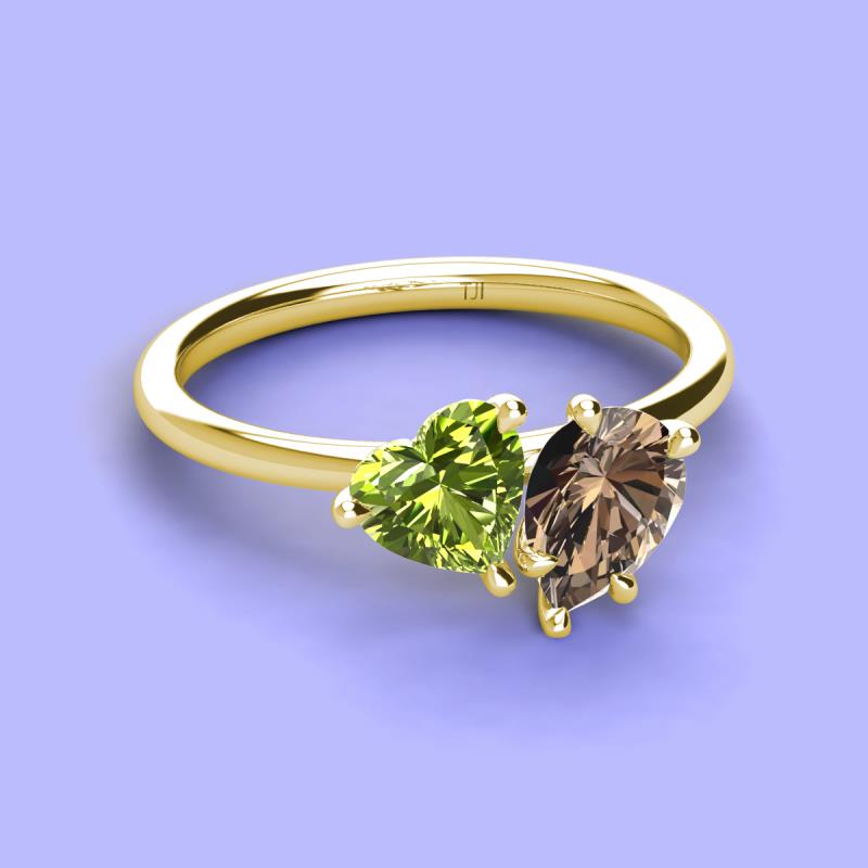 There's something so romantic, and oh-so-enchanting about this duo two stone engagement ring. This spectacular design features Heart shape Peridot and Pear Shape Smoky Quartz that sets at slight angles towards each other.