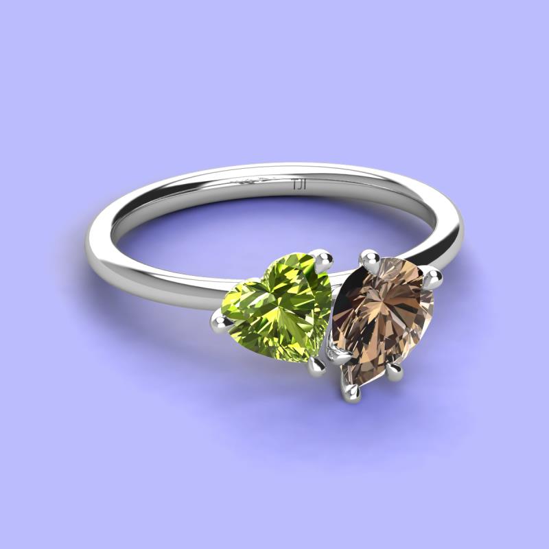 There's something so romantic, and oh-so-enchanting about this duo two stone engagement ring. This spectacular design features Heart shape Peridot and Pear Shape Smoky Quartz that sets at slight angles towards each other.