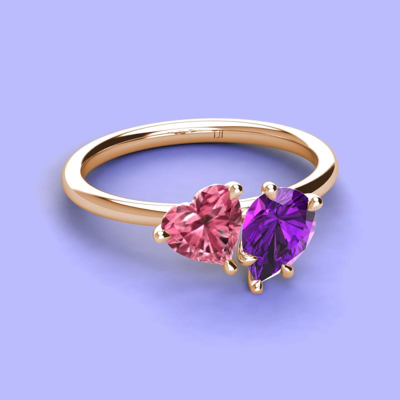 There's something so romantic, and oh-so-enchanting about this duo two stone engagement ring. This spectacular design features Heart shape Pink Tourmaline and Pear Shape Amethyst that sets at slight angles towards each other.