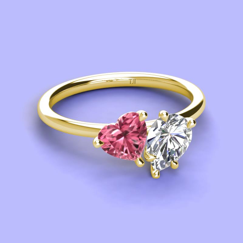 There's something so romantic, and oh-so-enchanting about this duo two stone engagement ring. This spectacular design features Heart shape Pink Tourmaline and Pear Shape Forever Brilliant Moissanite that sets at slight angles towards each other.