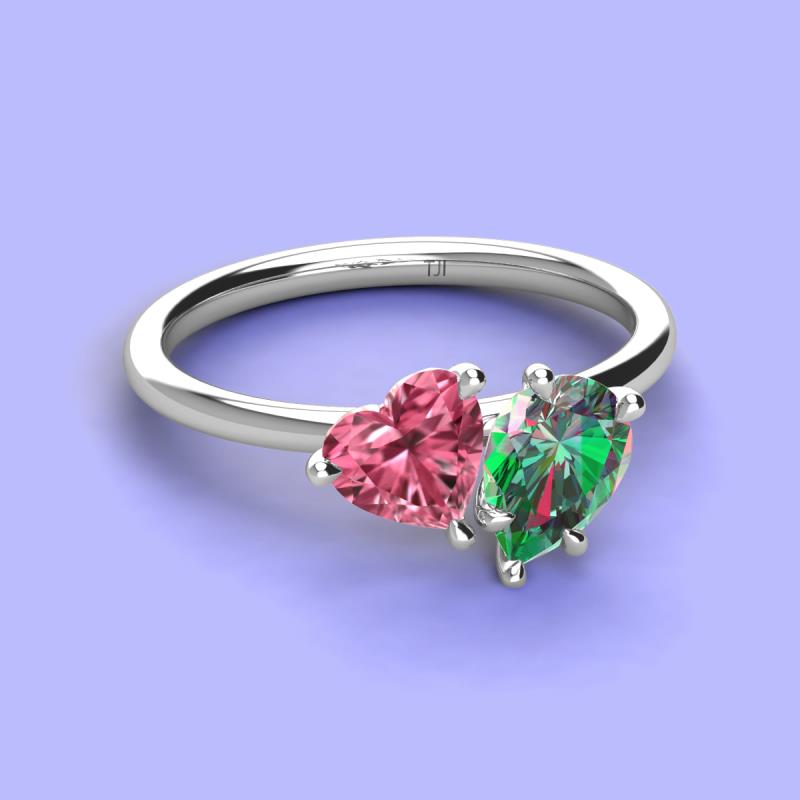 There's something so romantic, and oh-so-enchanting about this duo two stone engagement ring. This spectacular design features Heart shape Pink Tourmaline and Pear Shape Lab Created Alexandrite that sets at slight angles towards each other.