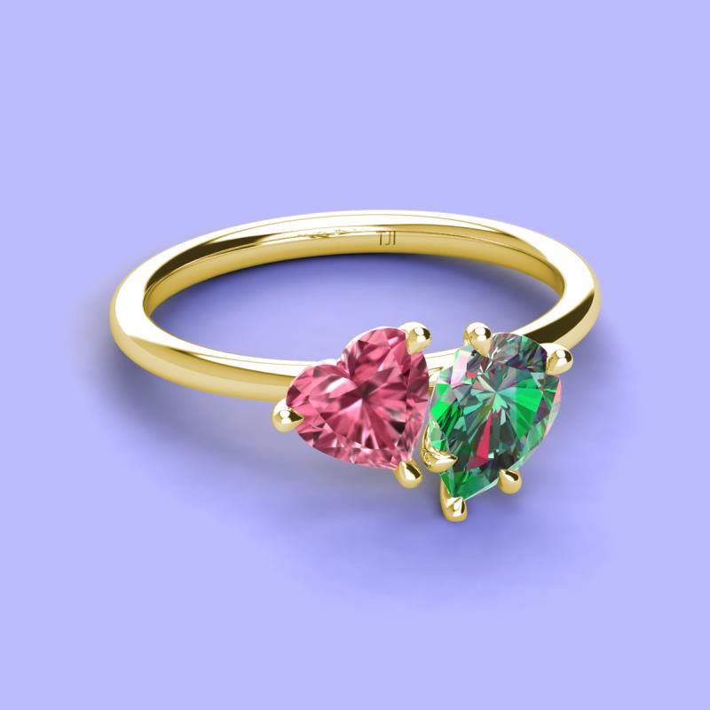There's something so romantic, and oh-so-enchanting about this duo two stone engagement ring. This spectacular design features Heart shape Pink Tourmaline and Pear Shape Lab Created Alexandrite that sets at slight angles towards each other.