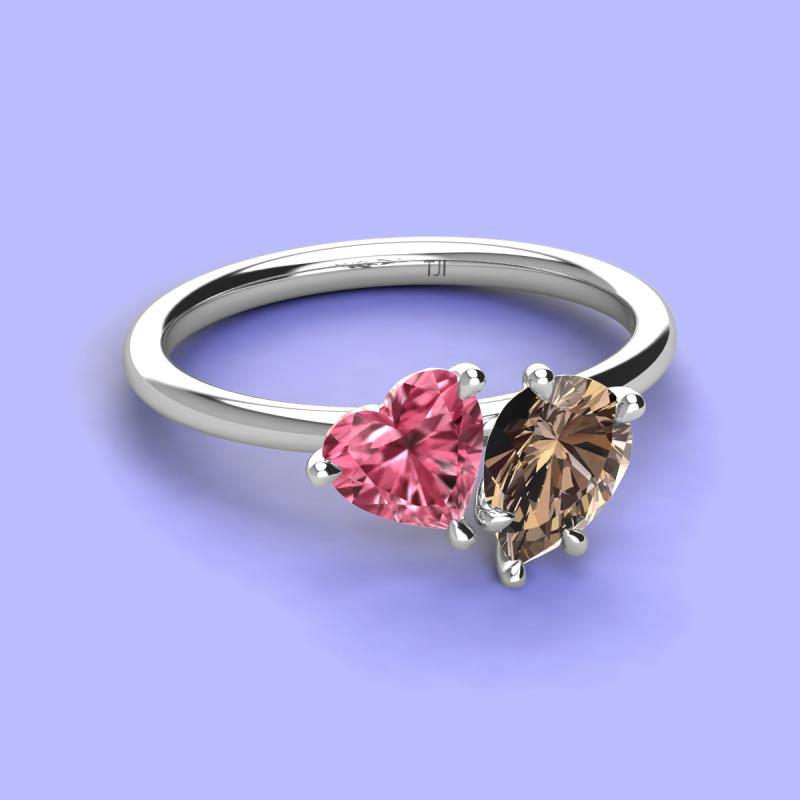 There's something so romantic, and oh-so-enchanting about this duo two stone engagement ring. This spectacular design features Heart shape Pink Tourmaline and Pear Shape Smoky Quartz that sets at slight angles towards each other.