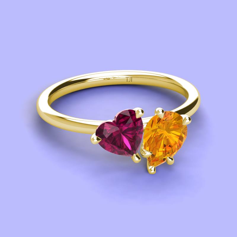 There's something so romantic, and oh-so-enchanting about this duo two stone engagement ring. This spectacular design features Heart shape Rhodolite Garnet and Pear Shape Citrine that sets at slight angles towards each other.
