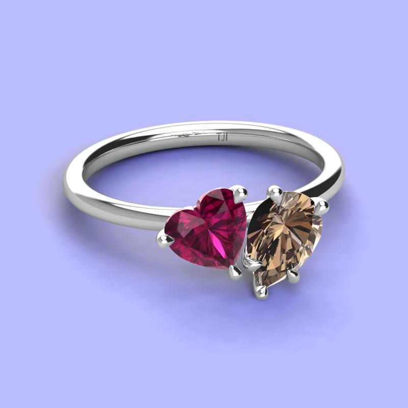 There's something so romantic, and oh-so-enchanting about this duo two stone engagement ring. This spectacular design features Heart shape Rhodolite Garnet and Pear Shape Smoky Quartz that sets at slight angles towards each other.
