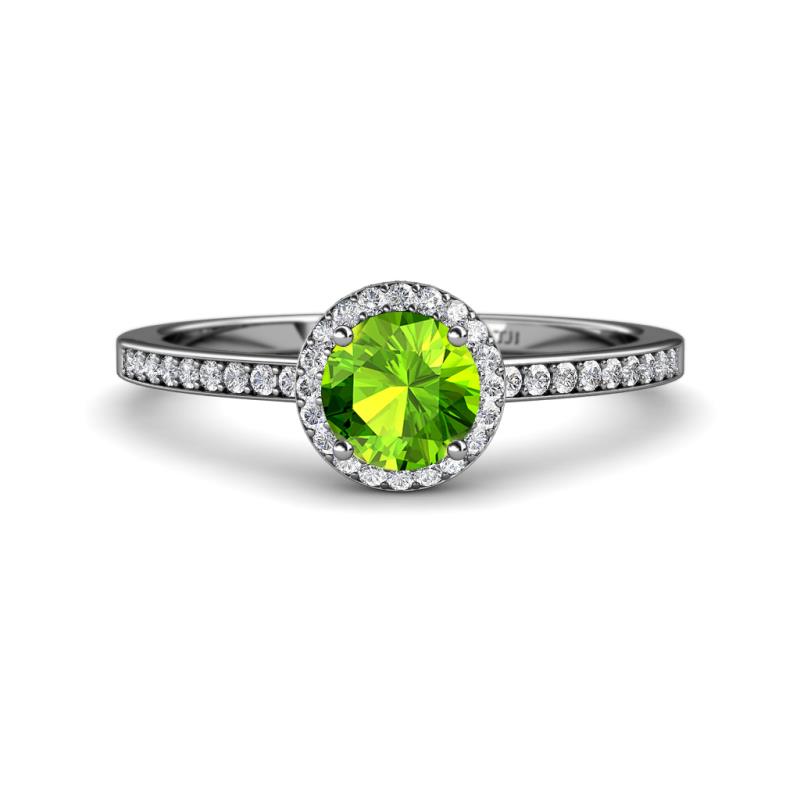 Dazzle and Delight her with this exquisite Engagement Ring contains Prong Set Center Peridot with Pave Set White Diamonds Over and Under Double Halo along with single straight Pave Set Diamond on Shank.