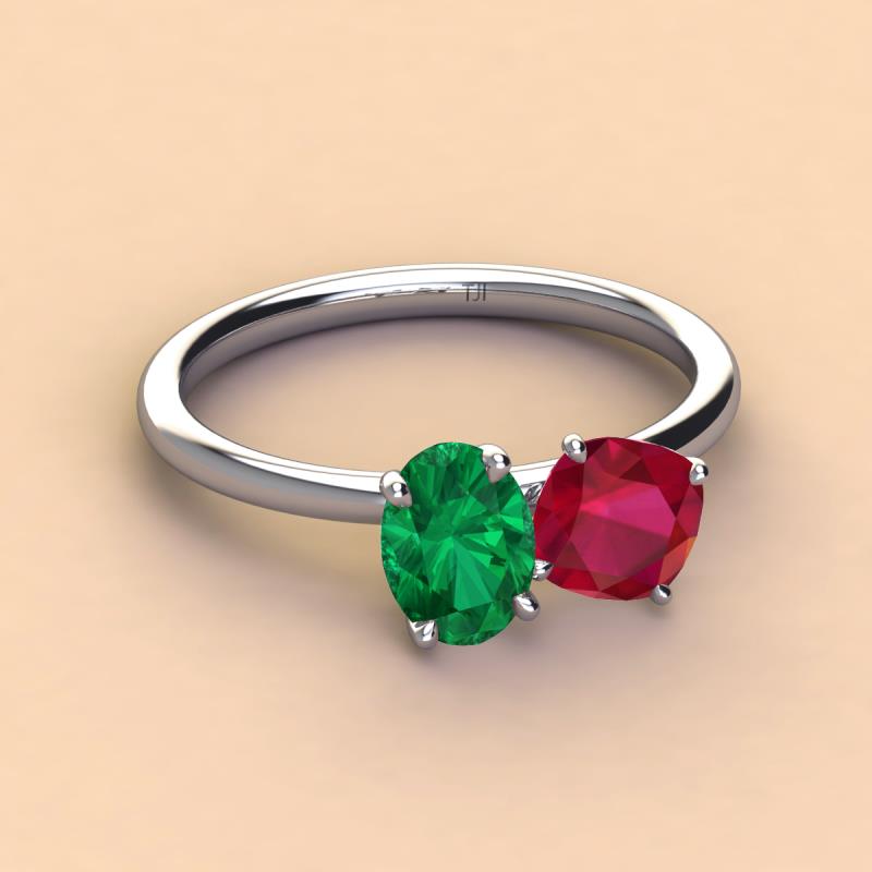 Two-stone Duo ring featuring an Oval shape Emerald and Cushion Shape Ruby crafted beautifully that will effortlessly blend with her casual outfits and evening dresses.