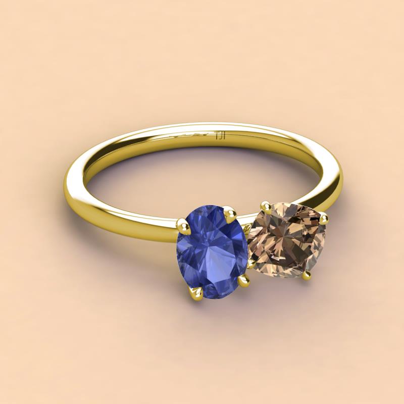 Two-stone Duo ring featuring an Oval shape Iolite and Cushion shape Smoky Quartz crafted beautifully that will effortlessly blend with her casual outfits and evening dresses.