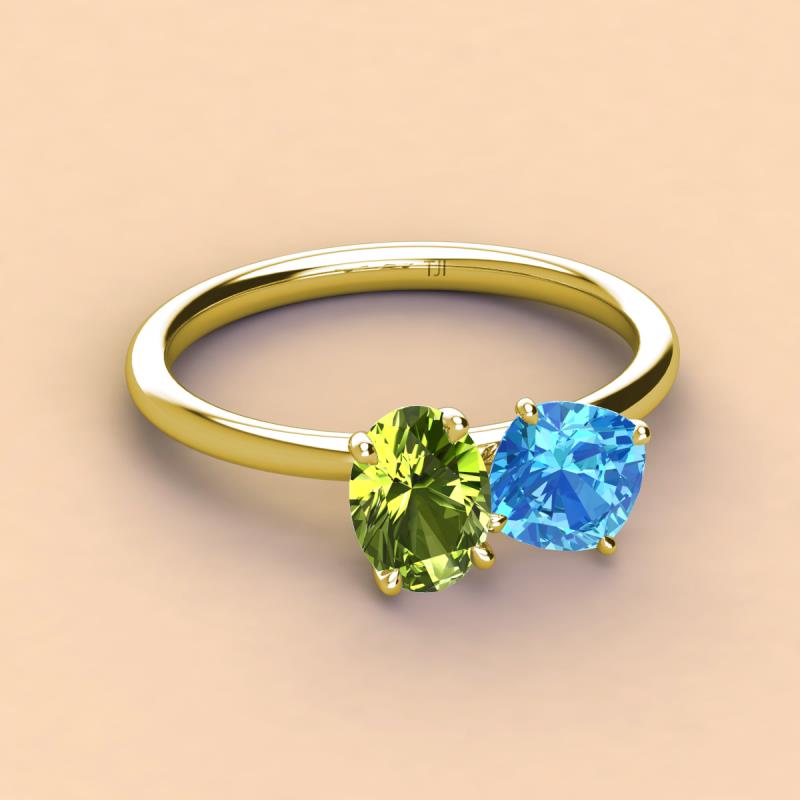 Two-stone Duo ring featuring an Oval shape Peridot and Cushion shape Blue Topaz crafted beautifully that will effortlessly blend with her casual outfits and evening dresses.