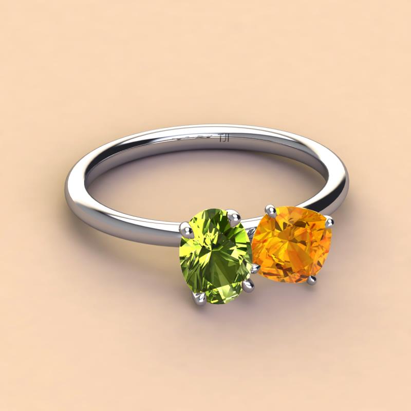 Two-stone Duo ring featuring an Oval shape Peridot and Cushion shape Citrine crafted beautifully that will effortlessly blend with her casual outfits and evening dresses.