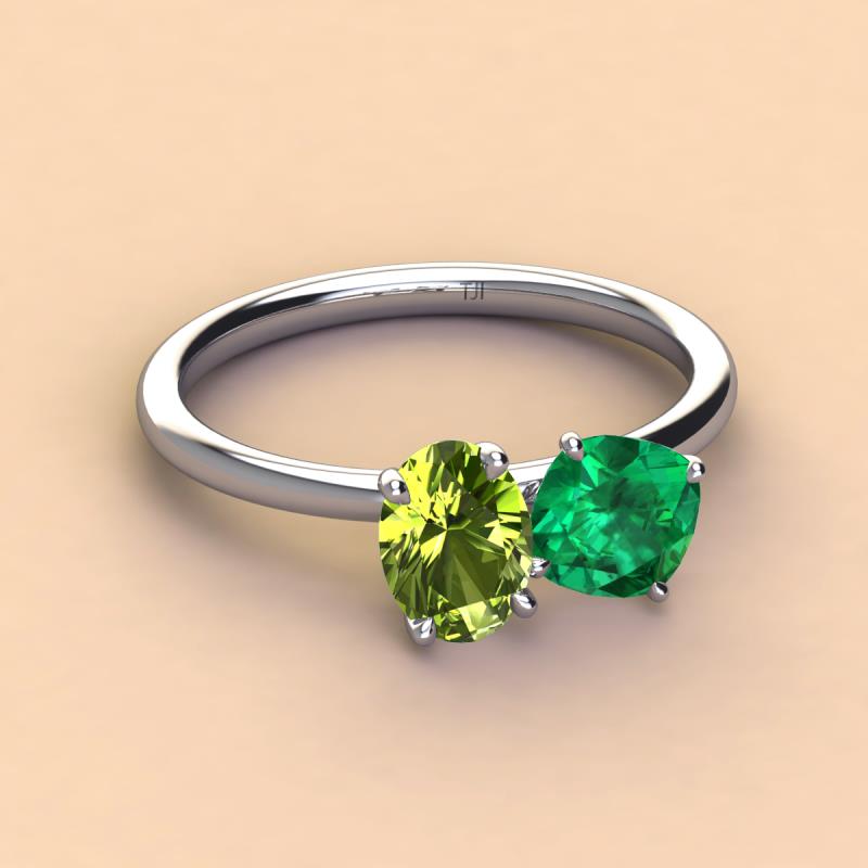 Two-stone Duo ring featuring an Oval shape Peridot and Cushion Shape Emerald crafted beautifully that will effortlessly blend with her casual outfits and evening dresses.