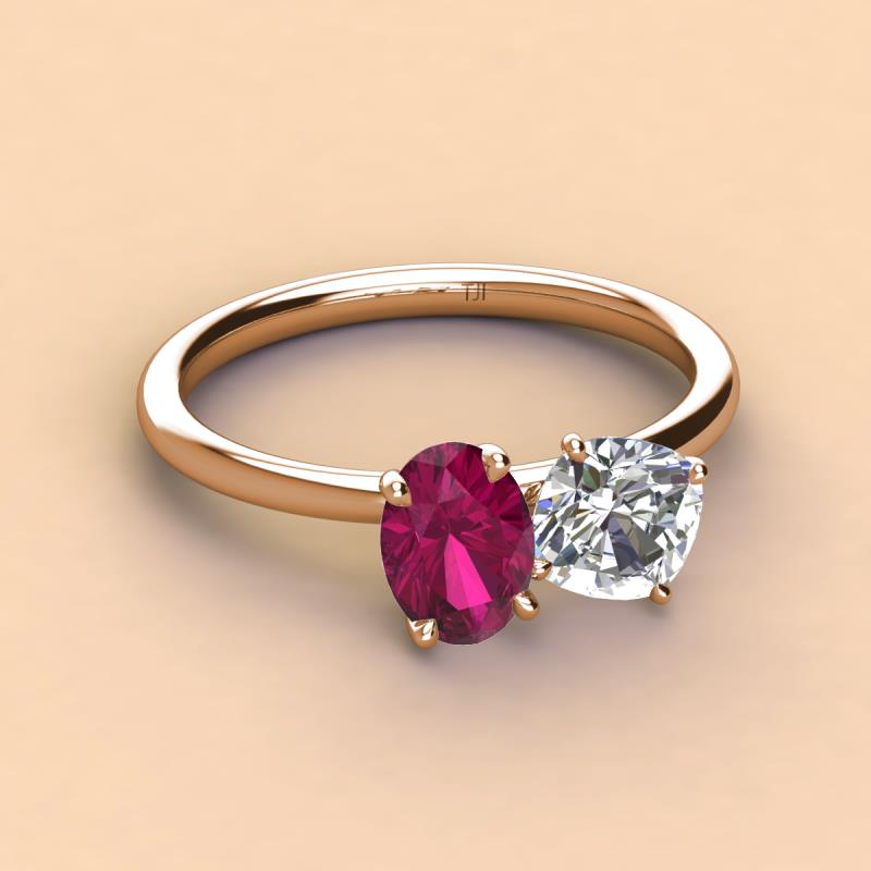 Two-stone Duo ring featuring an Oval shape Rhodolite Garnet and Cushion shape GIA Certified Diamond crafted beautifully that will effortlessly blend with her casual outfits and evening dresses.