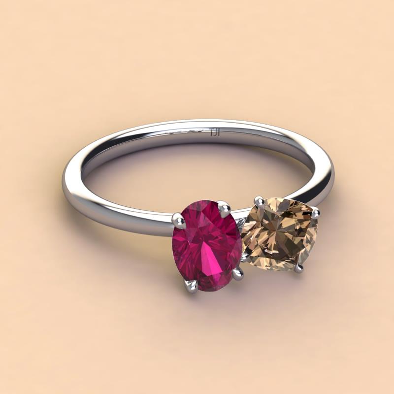 Two-stone Duo ring featuring an Oval shape Rhodolite Garnet and Cushion shape Smoky Quartz crafted beautifully that will effortlessly blend with her casual outfits and evening dresses.